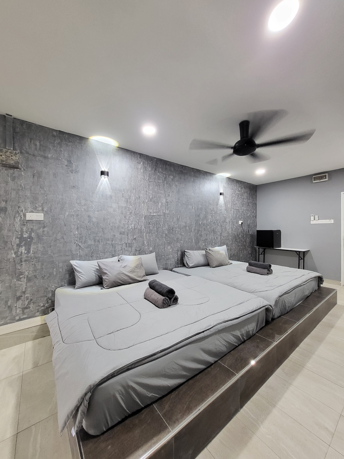 这是家庭房可以容纳5-7人住宿,房内有提供冷气和私人浴室,浴室也有热水器。 *民宿是一间双层排屋在保安区内,拥有5房间,5间浴室,房内提供冷气以及浴室也有热水浴, 民宿前面还有公园让你们和孩子有玩乐放松的休闲处.