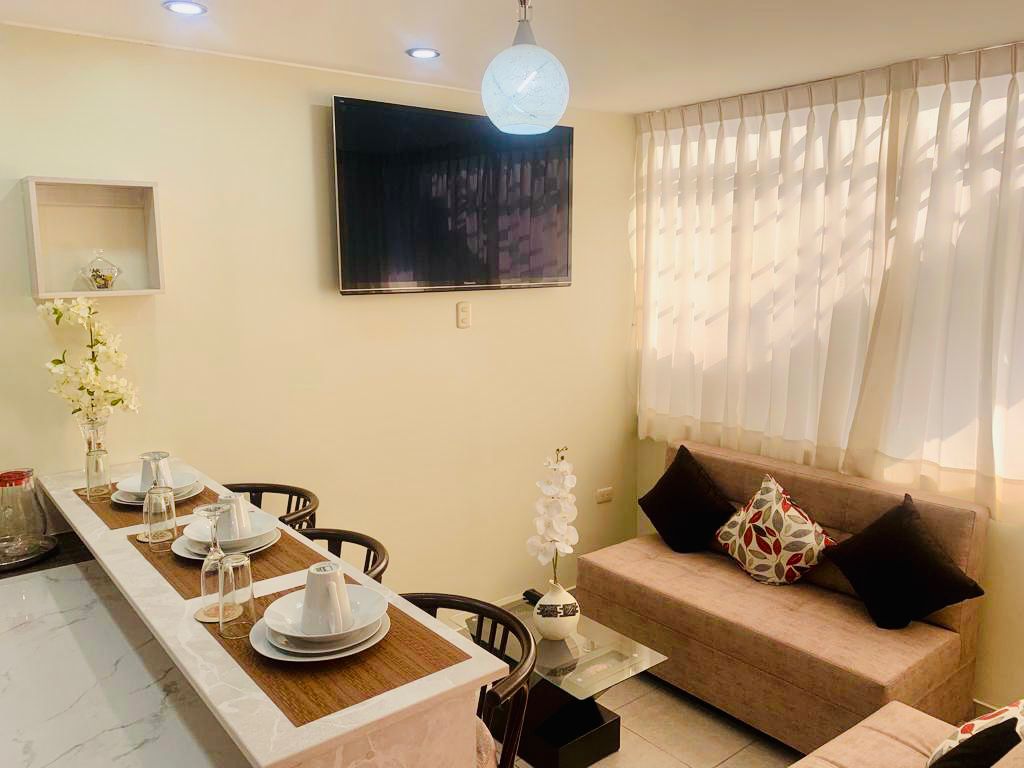 Modern premiere entrepà, amb terrassa i graella ! , equipat amb taula de treball ideal per treballar des de casa amb wifi d'alta velocitat, televisor de 65', habitació amb un llit de 2 places. Sala d'estar, cuina petita amb tot el que necessites per cuinar. S'han d'utilitzar les escales del tercer pis. Terrassa amb graella i vistes al carrer Situat al districte José Luis Bustamante, a 5 minuts de la U. San Martín de Porres, Tecsup, Mall Aventura Plaza , OutletArauco i a 15 minuts del Centre Històric.