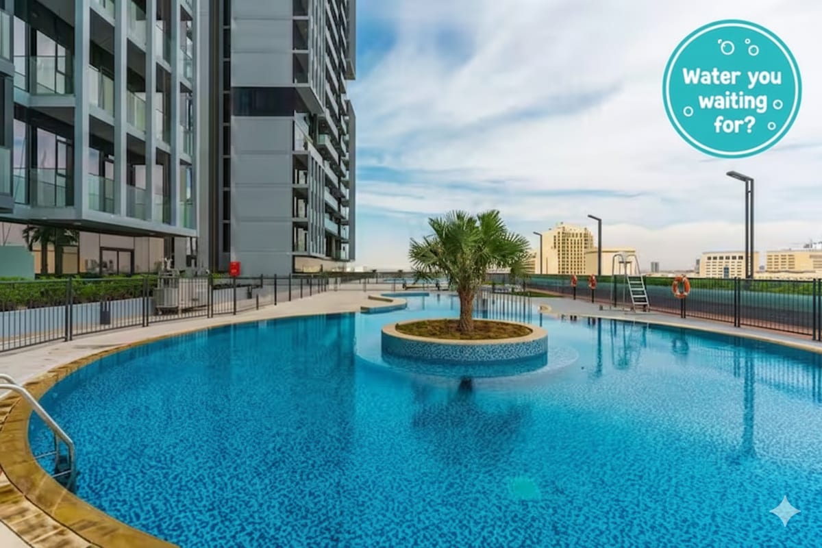 Descomptes mensuals disponibles! Gaudeix d'un confort elegant en aquest apartament d'1 habitació amb un disseny preciós i vistes a la piscina. Amb un sofà de color crema, un menjador modern per a quatre persones i una cuina totalment equipada, és perfecte per a una estada relaxant. El dormitori amb llit «king size» inclou llençols de qualitat hotelera, un tocador i accés directe al balcó. Gaudeix d'un bany complet, un tocador i un paquet de benvinguda amb articles de tocador. Ideal per relaxar-se, amb mobles elegants i un balcó privat per a un retir perfecte a Dubai