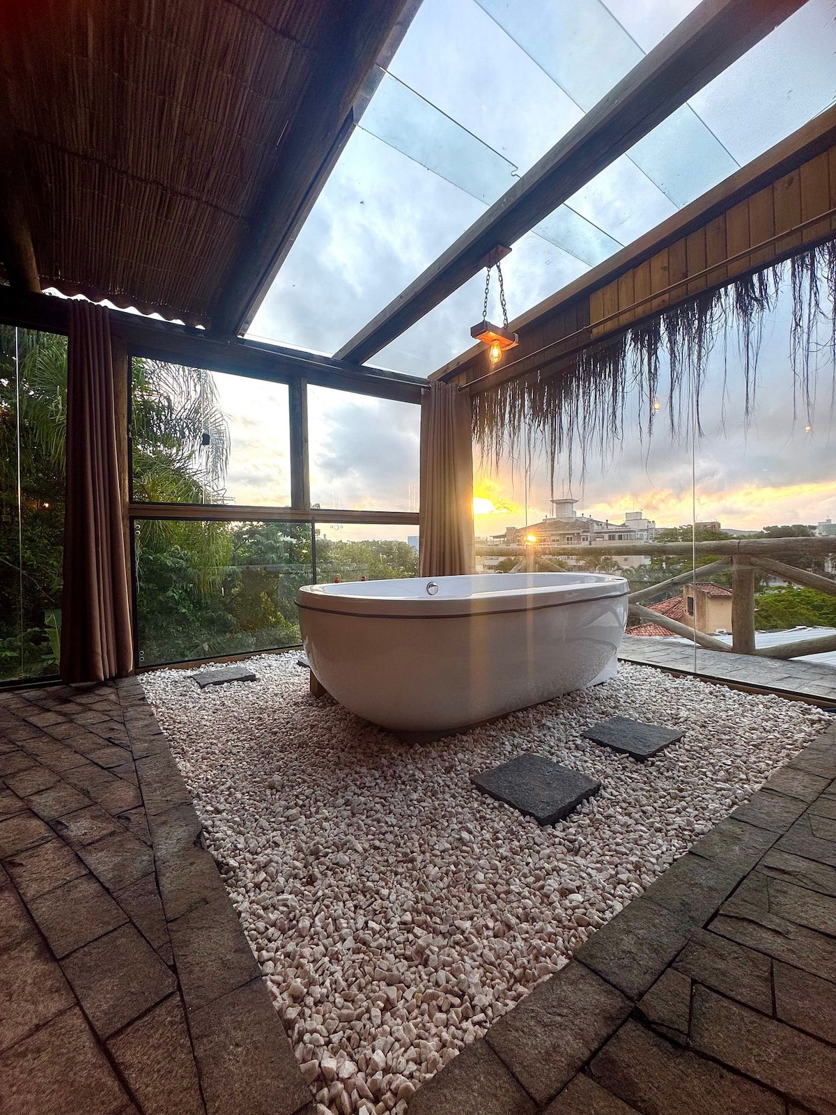 Som l'experiència @hivernacle Una escapada exclusiva en plena natura, a només 3 km de Jurerê International. El nostre xalet, perfecte per a parelles, ofereix el confort essencial per a una experiència inoblidable per connectar amb la natura. Relaxa't al porxo envoltat d'arbres, gaudeix de la sauna seca, del jacuzzi exterior i escalfa't a la llar de llenya. La propietat també té una unitat residencial i una altra caseta, on hi ha un espai terapèutic per als hostes i els visitants.