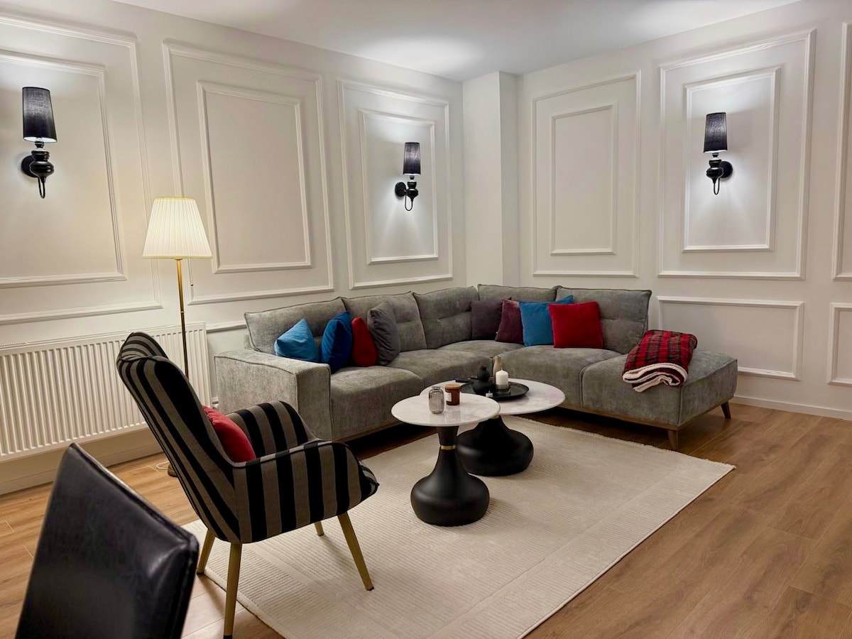 Una degustació cosmopolita d'estil tradicional de masia albanesa en un apartament de disseny recentment renovat del 8è pis (amb ascensor), dissenyat amb mobles tradicionals d'estil rural, artefactes restaurats, espectacular llar de foc de mosaic i sofra creats per un artista local. Cèntric però tranquil. La peça central és un menjador/cuina molt espaiós que combina la comoditat moderna amb les característiques d'una oda (l'habitació clau per socialitzar en cases rurals tradicionals albaneses). Amfitrions que parlen anglès, albanès i serbi
