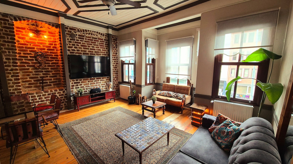 Aquesta és la nostra llar. Ens encanta. Ens importa, també ens preocupem pel sentit de l'espai i la qualitat del temps. Esperem que tu també ho facis. Aquesta unitat de 160 m2 (1700 metres quadrats) amb sostres alts, 1 dormitori es troba a la quarta planta d'un edifici semirresidencial històric. Tot i que ens encanta pensar que el lloc està ple de pau, comoditat i personalitat; la veritable màgia és exactament on es troba. Està gairebé a un minut dels ferris i d'alguna manera es troba tranquil·lament enmig de l'enrenou de Kadikoy.