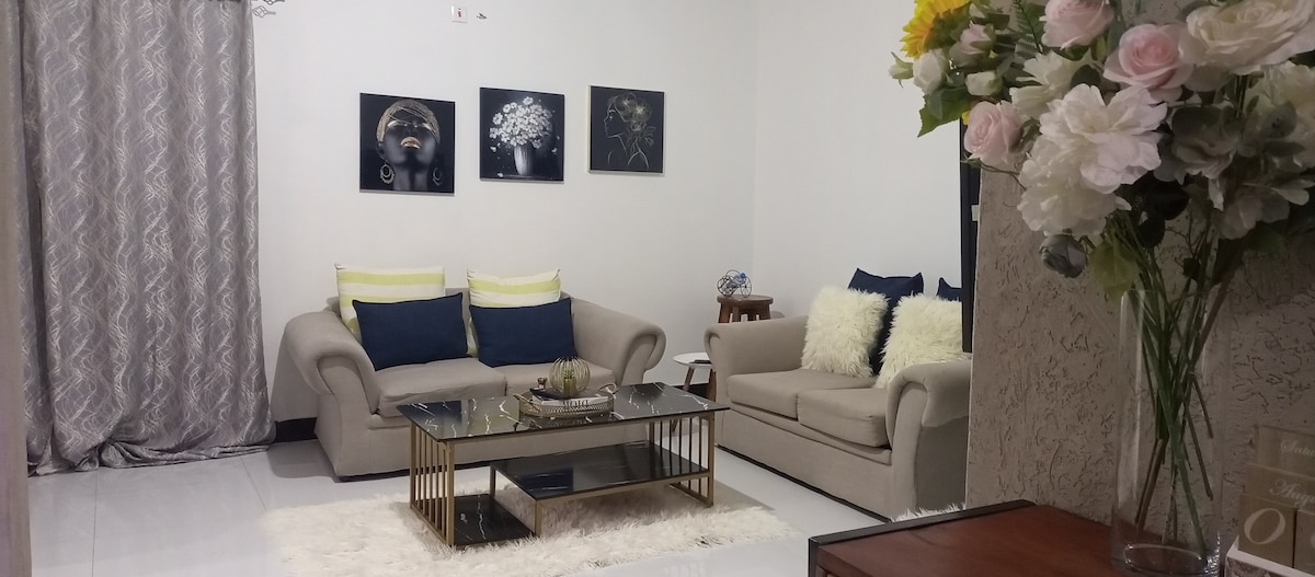 Si busques un lloc tranquil per relaxar-te, no busquis més, aquest apartament semi independent de dos dormitoris es troba a prop de la zona de Bonaventure Makeni, no gaire lluny dels centres comercials Makeni i Cosmopolitan. Gaudeix de la bonica vista privada dels jardins amb una porta automàtica de l'entrada independent i càmeres de seguretat exteriors. Aquest apartament independent està totalment moblat i disposa de cuina funcional, aire condicionat, wifi, televisor intel·ligent, rentadora, planxa i microones.