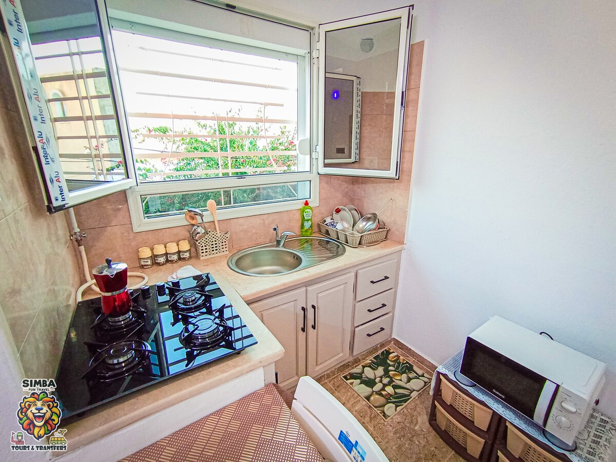 🏠 Acollidor i elegant! Aquest niu assolellat té capacitat per a 2 hostes amb: ✔ 2 llits còmodes 🛏️ Brisa al ✔ balcó 🌬️ ✔ Minicocina americana 🍽️ 🚀 Bonus avantatges que t'encantaran: Garatge ✔ compartit (cotxe/motors) 🚗 + eines (rentadora, planxa, bressol) ✔ No gaire lluny de la Medina 🏰 • Espai de treball 💻 • Aire condicionat ❄️🔥 aigua ✔ calenta🔥 + dolços + llibres electrònics de viatge 📚 Seguretat ✔ les 24 hores 🔒 🎯 Perfecte per a: parelles, soles o dúos que s'uneixen a un grup més gran! ✨ Psst... This is 1 of 3 same floor apartments! Necessites més espai? Envia'ns un missatge per reservar un altre pis (o dos!)