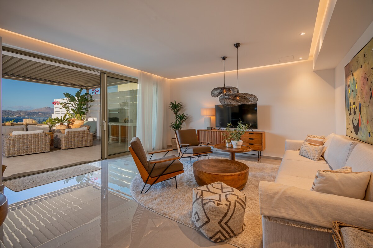 Enjoy the stunning, panoramic views of Souda Bay whilst pampering yourself in luxury. Seascape is the ultimate penthouse. Forming part of Panorama Village, a newly built complex in Kalyves Crete, Seacape’s 120m2 roof terrace makes you feel you are part of the mystical Aegean Sea. Furnished to an extremely high end, couples can enjoy year round comfort with an ultra modern heating and cooling system, calming wall art, high speed internet, modern utilities, pool and breathtaking sunrise/sunsets.