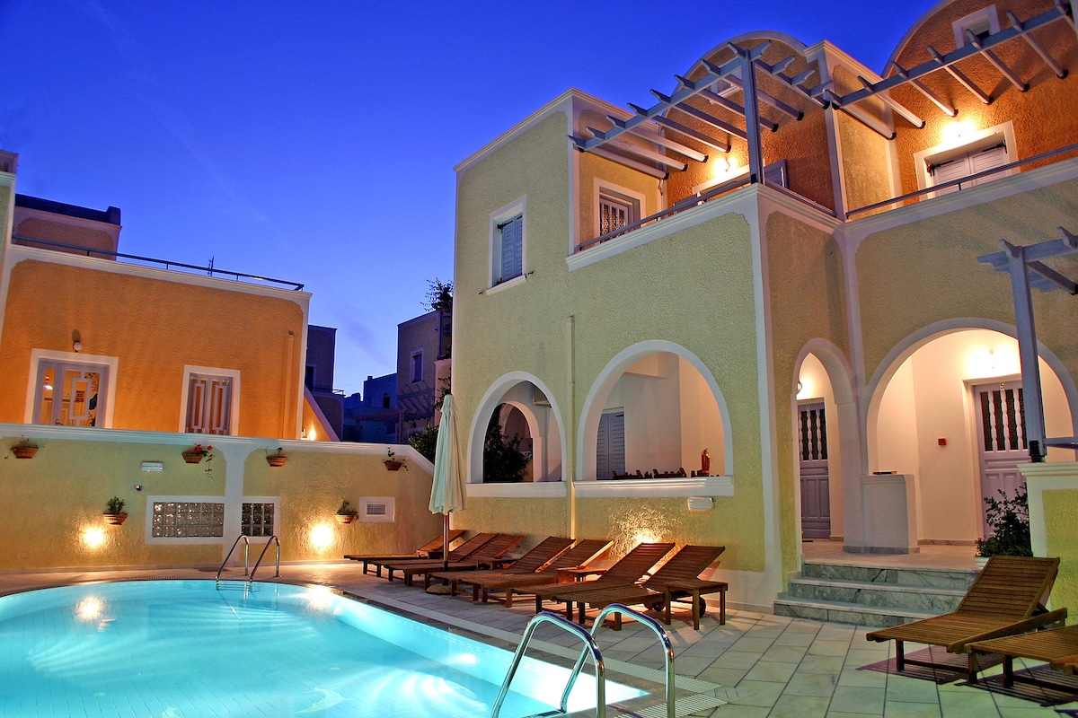 Pis acollidor al cor de Thira . Una habitació per a dos amb un llit molt còmode, un bon balcó i una petita cuina equipada amb tot el que necessitaràs per a la teva estada . Una petita piscina( no privada )per als dies assolellats. Estem situats a només 100 metres del centre per poder oferir-te una estada agradable i tranquil·la, però també poder arribar a tot amb un passeig de 2 minuts. A prop de l'estació d'autobusos, restaurants , cafeteries i bars.