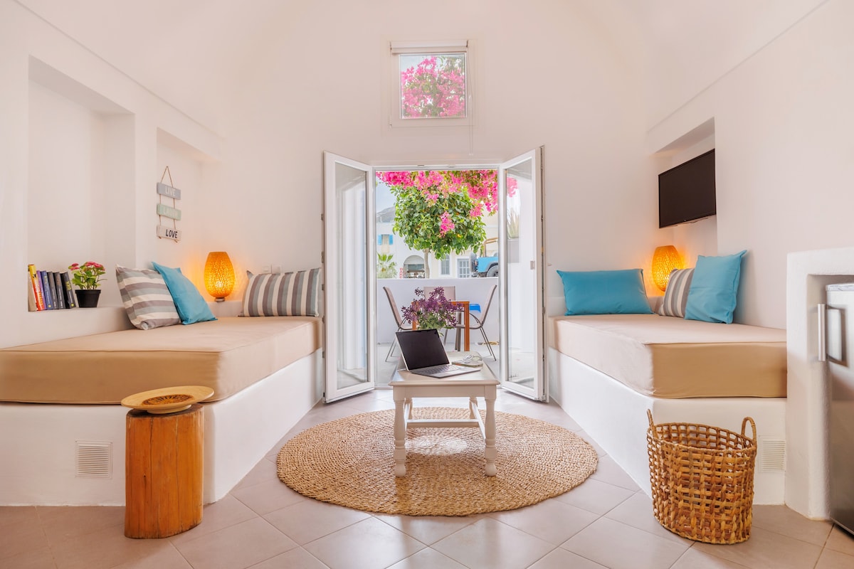 Traditional accommodation in Kamari-Santorini fully renovated in 2018 surrounded by an old grand bougainvillea. Just 500 meters from the famous black beach and within walking distance of restaurants, bars and shops. The area is traditional style mostly among locals. Our house is ideal for families with children and couples. Clean, simple and functional made with love for you.