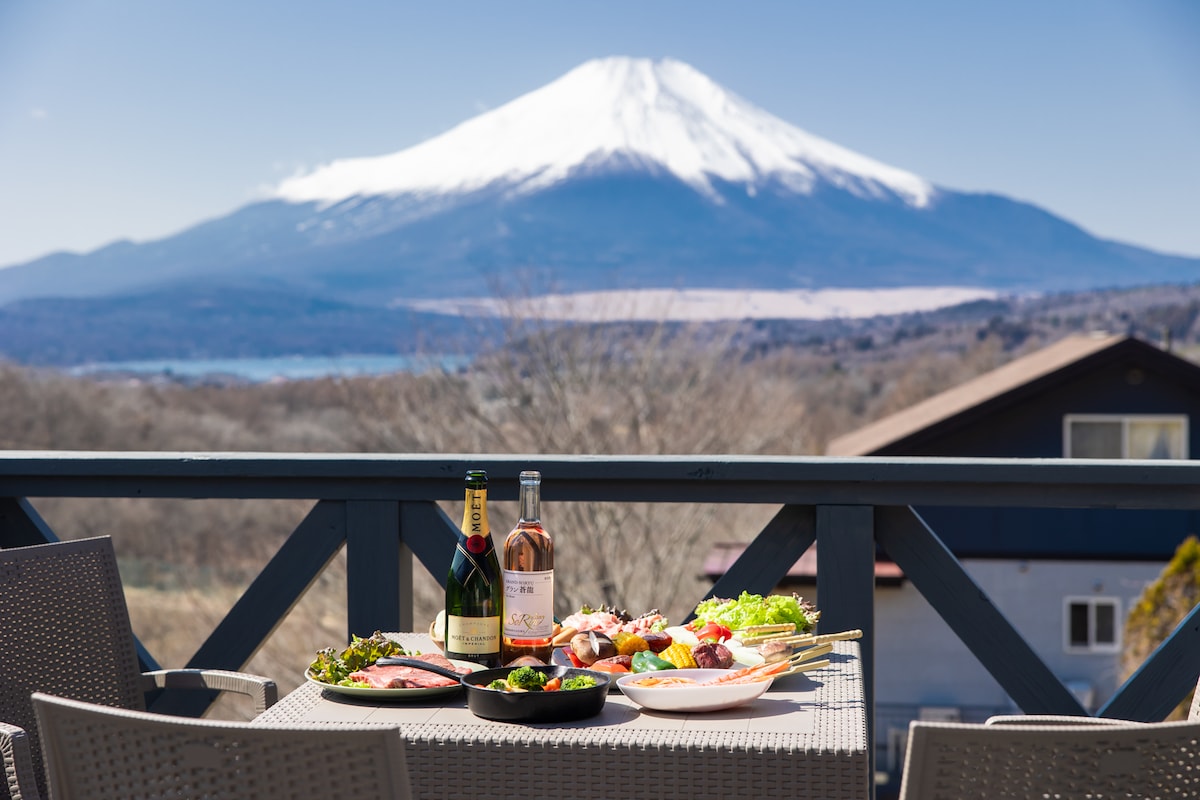 Sauna, barbacoa i foguera, vil·la per a adults amb vistes al Mont Fuji i al llac de la muntanya