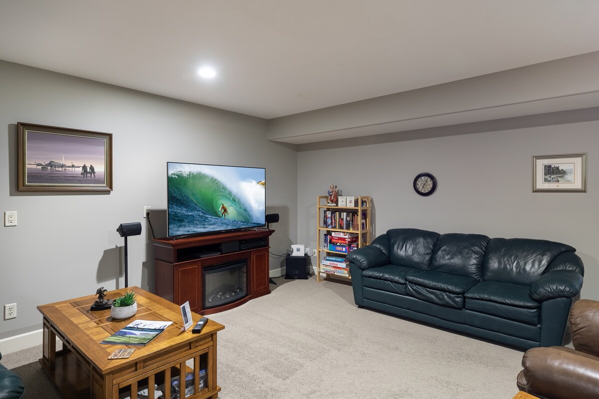 La nostra suite d'un dormitori té la seva pròpia entrada privada, una gran sala d'estar, una llar de foc interior i un cinema amb un projector de 125" (Netflix, Amazon Prime). Acollidor pati amb barbacoa i vistes a la muntanya sense obstacles en un barri tranquil i segur. Estem a minuts del camp de golf Black Mountain, del Fab Five Wine Trail de Kelowna, de les hortes Kempf & Arndt U Pick. A 15 minuts del centre de la ciutat, a 10 minuts de l'aeroport, a 40 minuts de Big White.