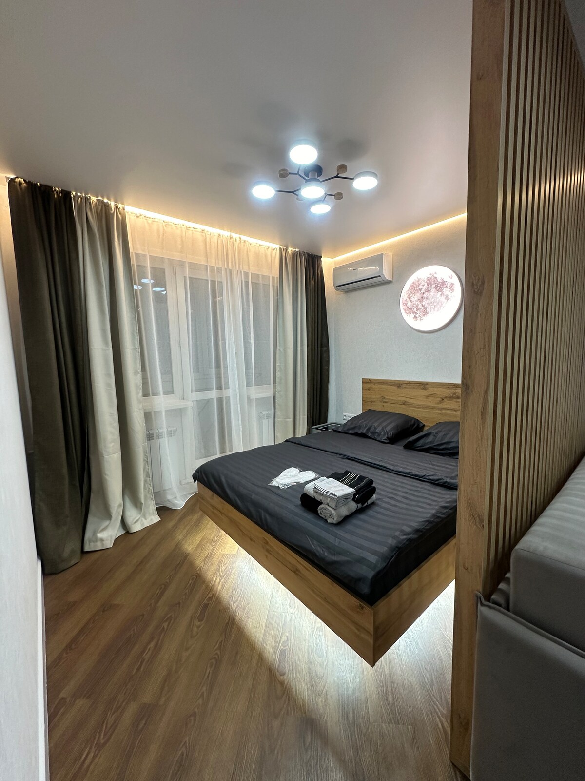Et convidem a submergir-te en l'atmosfera d'un estil brutal i romàntic amb notes de romanticisme motard. L'apartament està al centre de la ciutat i està equipat amb tot el que necessites per gaudir d'una estada còmoda. Una vista magnífica des de la loggia equipada aportarà romanticisme i el projector de pel·lícules et permetrà gaudir mirant la gran pantalla. Llocs per dormir: un llit gran i un sofà plegable. Et donem la benvinguda! La teva comoditat és la nostra prioritat.