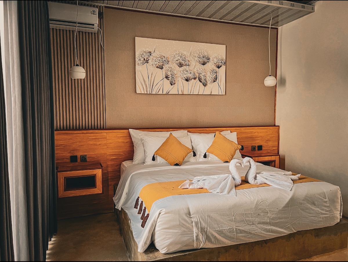 This spacious 1-bedroom villa is set in a lush garden in peaceful Tembuku, Bangli. Just 10 minutes to restaurants, resorts with pool access, and waterfalls. Features include an en-suite bathroom with bathtub, Smart TV with Netflix, A/C, ceiling fan, Wi-Fi, and a fully equipped kitchen. The bedroom and living area are enclosed to a terrace and garden with Mount Agung views perfect for relaxing, meditation and enjoying morning coffee. Guests should have their own motorbike or car for easy access.