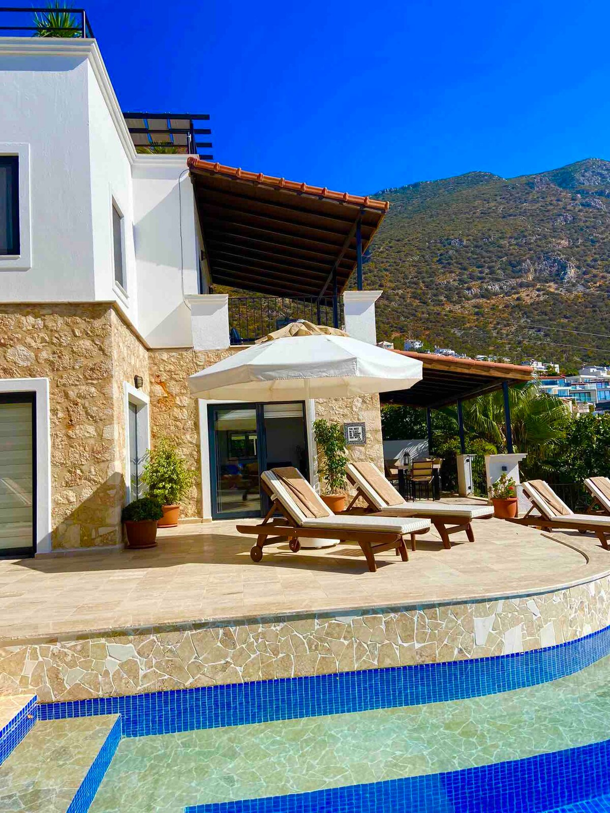 Oblida't de les preocupacions a Villa Kacis, dins dels seus propis jardins privats i sense passar per alt. 4 dormitoris de luxe, tots amb bany modern i balcons privats. Situat en una ubicació privilegiada amb vistes panoràmiques al mar a la badia de Kalkan i a només 15 minuts a peu del casc antic. Gran terrassa a la planta baixa, amb gran piscina privada en forma de L, bonica zona de menjador cobert exterior, a més d'una magnífica terrassa amb pèrgola i àmplies seients. Privat i sense passar per alt.