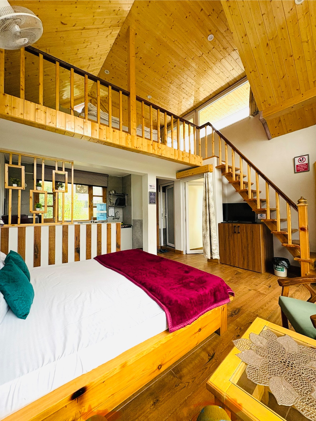 Have fun with the whole family at this stylish place. You will have spacious and Luxury Duplex chalet suitable for one couple or a family of four guests. ★ Master bedroom & attic ★ Wooden & Stone Architecture ★ Panoramic Valley view ★ Nearby Paragliding site ★ Bathtub ★ Power backup ★ WiFi ★ Indoor Fireplace ★ in-house food service ★ Garden & Bonfire area Please note : - Breakfast, Meals, Room heaters, Firewood, & all other services are exclusive of stay price here