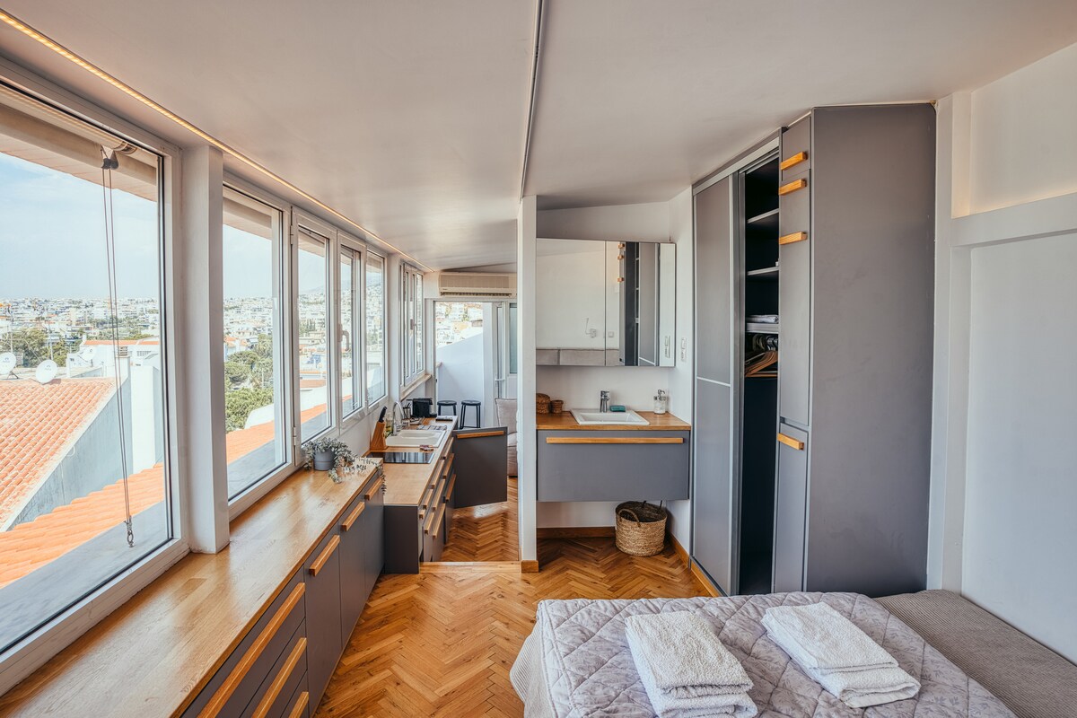 El nostre estudi boutique (24 metres quadrats) a la 4a planta està perfectament situat al costat del mar a la prestigiosa zona de Voula, amb una vista increïble sobre el golf Saronic fins i tot des de la comoditat del teu llit. La seva ubicació ideal et dona l'oportunitat de gaudir d'una gran varietat de llocs de platja i també et proporciona un accés fàcil i ràpid al transport públic. Completament renovat el 2019 té l'objectiu de fer que la teva estada sigui molt còmoda i enriquir la teva experiència de viatge! Ideal per a parelles, amics o viatgers de negocis.