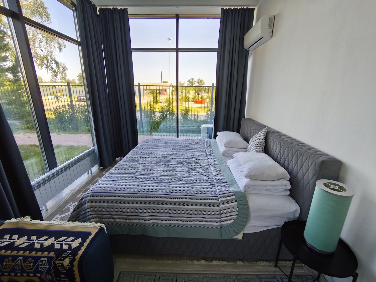 Pis acollidor amb disseny europeu al centre d'Astana. A 2 minuts del passeig marítim, Central Park i la platja. A prop de Duman, Oceanarium, Khan Shatyr, Baiterek. Perfecte per a viatges de negocis i escapades romàntiques. Casa tranquil·la, interior elegant, tot per gaudir d'una estada còmoda.