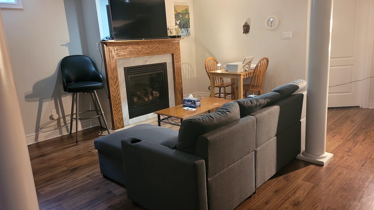Et donem la benvinguda al nostre acollidor pis soterrani! Aquest modern Airbnb es troba en un barri residencial tranquil a 40 minuts en cotxe del centre de Toronto i a una hora de les cascades del Niàgara. L'espai ben il·luminat disposa d'un llit còmode de matrimoni, un ampli magatzem a l'espaiós armari i un interior bellament dissenyat amb llum natural que s'inunda a través de grans finestrals. Nota: tenim 2 matalassos plegables individuals disponibles per col·locar a terra a la sala d'estar. Hi ha llençols i coixins addicionals.
