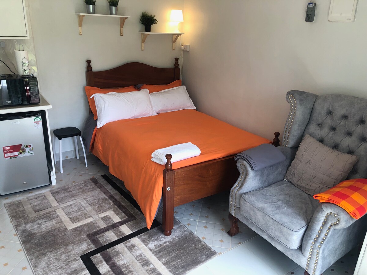 A només 5 minuts a peu de la platja de Nyali, aquest acollidor apartament estudi ofereix tot el que necessites per gaudir de les vacances perfectes, una trobada o una estada a la regió costanera de Mombasa/ Kenia. L'espai és el lloc perfecte per relaxar-se després d'un dia d'exploració/treball, amb un suau llit de teca africana (mvule), una encimera i una pantalla plana muntada a la paret amb accés a centenars de canals. El pis té nevera i microones que et faran sentir com a casa.