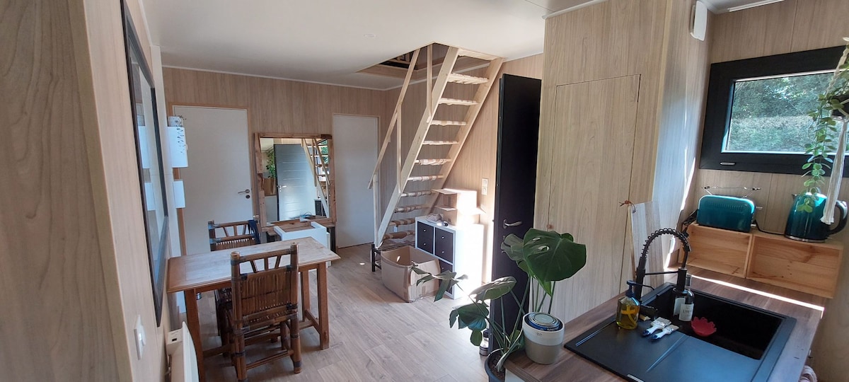 Hola, aquesta encantadora casa consta de cuina, sala d'estar i dutxa amb vàter. A dalt hi ha una habitació amb 2 llits individuals i un entresol amb 1 llit doble. A l'exterior, una taula 6 persones amb para-sol, 4 gandules i una habitació per allotjar les bicicletes o altres.