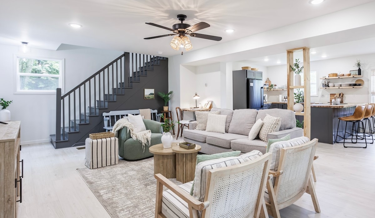 Deixa que la tranquil·la i tranquil·la bellesa de la regió de Finger Lakes de Nova York et renovarà en aquesta moderna i brillant granja a la ruta del vi Seneca Lake. Gaudeix del nostre espai exterior i de la comoditat de la segona planta privada del nostre nou edifici, que compta amb il·luminació natural, entrada privada, accés independent, taulells de marbre, rajoles per tot arreu, un bany personalitzat, calor radiant al terra, wifi, televisor i una terrassa espaiosa amb vistes a Black Squirrel Farms, un funcionament i processament de noguer negres.