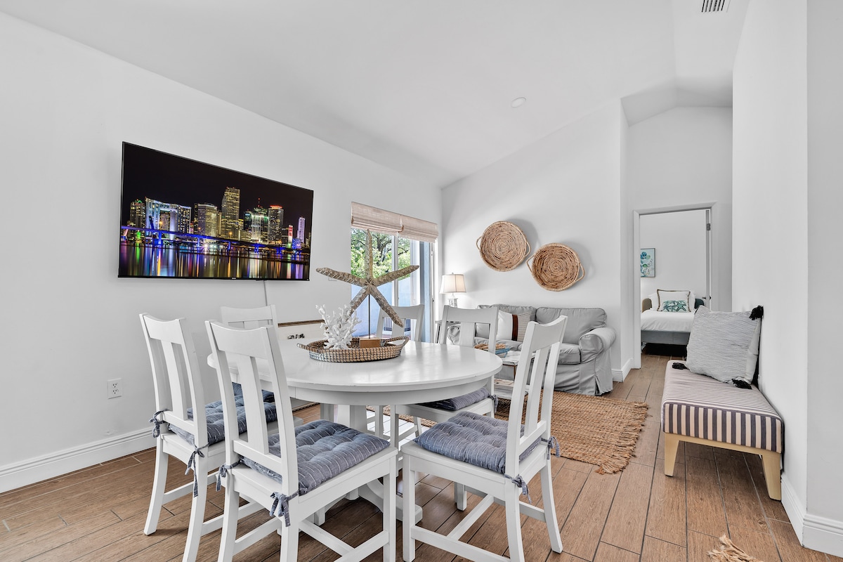 Encantador pis d'1 dormitori amb piscina, situat al centre de la preciosa illa de Key Biscayne. Capacitat per a 4 persones, ja que hi ha un llit «king size» al dormitori i un sofà llit a la sala d'estar. A uns passos de la botiga de queviures, restaurants, botigues i parcs més propers, a 1,5 blocs de la platja privada amb accés privat. A 13 minuts en cotxe del cor de Brickell A 15 minuts en cotxe de Coconut Grove A 25 minuts en cotxe de Miami Beach