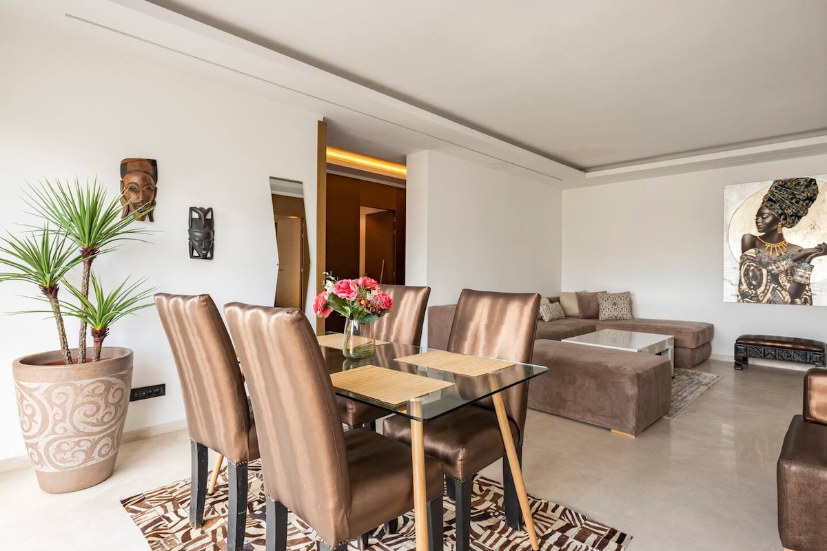 A l'interior del barri de Rabat, el més prestigiós de Souissi, hi ha un santuari de luxe de 2800 pies quadrats a la prestigiosa Place Des Zaers compund. Aquest refugi elegant ofereix una decoració vibrant, àmplies sales d'estar, una cuina totalment equipada i un jardí serè per relaxar-se. Amb aparcament subterrani segur i serveis de neteja i cuina opcionals a petició, i a pocs minuts de Royal Golf Dar Essalam, promet una barreja excepcional de comoditat i sofisticació per a una estada a la ciutat realment refinada.