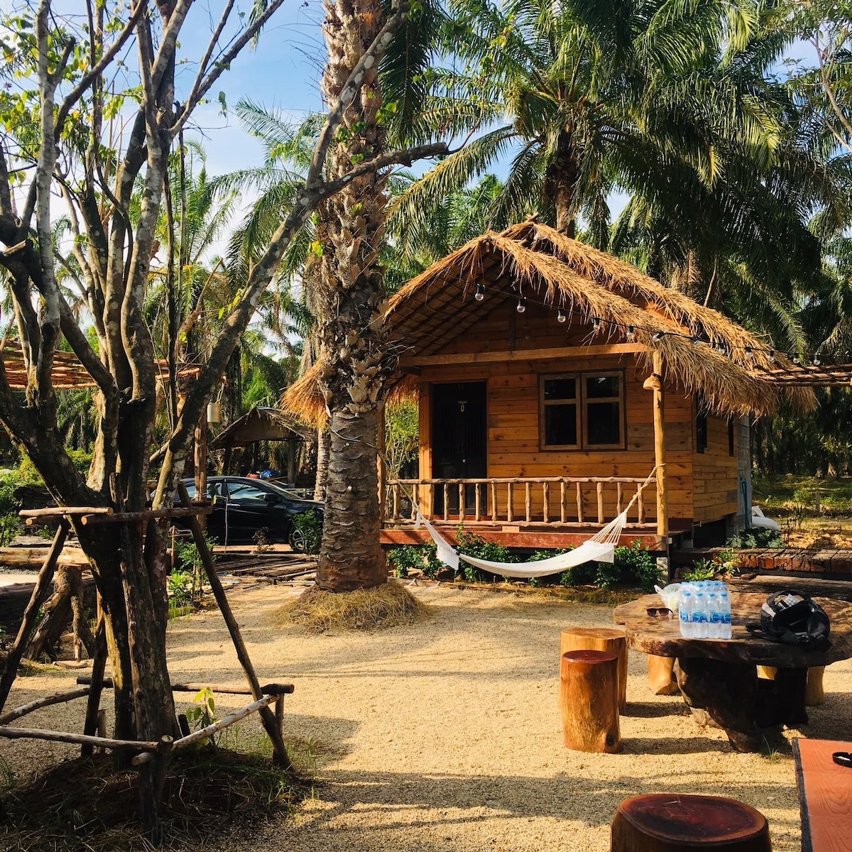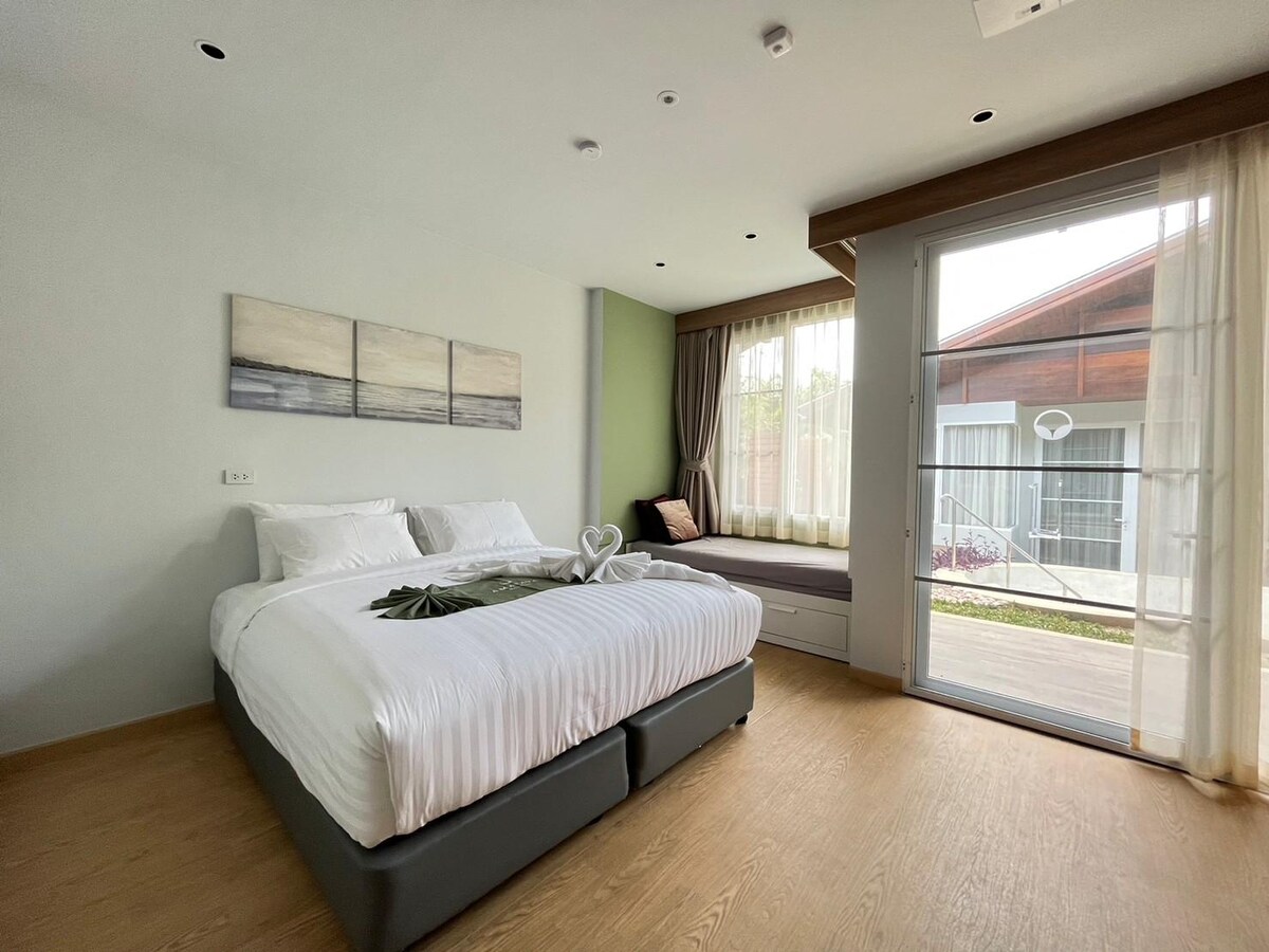 El nostre allotjament es troba al municipi del districte de Khlongthom, província de Krabi. És a prop de restaurants, botigues, grans magatzems, mercats frescos i moltes atraccions turístiques de la zona. Som una petita casa familiar, una casa de jardí en un jardí de palmeres en una zona de 7 rai (aproximadament 2,8 acres), que és al costat d'un canal natural. Està completament tancat. Pots portar els teus animals de companyia perquè corrin pel jardí i s'asseguin al costat del canal.