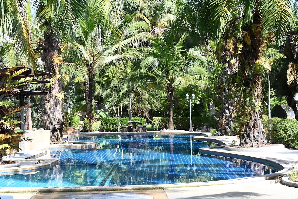 Aquest allotjament elegant és perfecte per explorar Krabi. Ideal per relaxar-se i relaxar-se. Pis molt agradable i ben equipat enmig dels penya-segats de pedra calcària típics d'aquí. Terrassa molt gran, sala d'estar amb televisor, dormitori amb llit doble «king size». Cuina amb equipament, tot amb aire condicionat. Bany amb dutxa i vàter. Piscina de 50 m ² + amb banc de massatge de bombolles relaxants, terrassa compartida de 200 m² al jardí i zona d'estar coberta. SuperCheap mercat al costat.