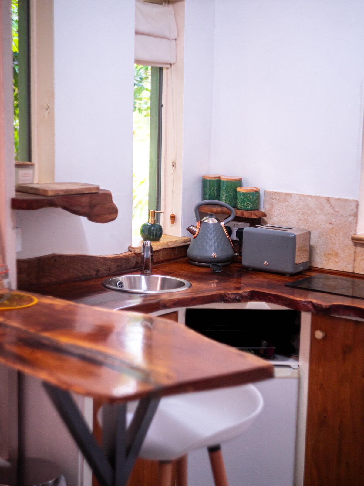La cabana en un arbre❤️ Templar és un tresor amagat ideal per a parelles i famílies romàntiques amb fills petits i ben comportats. *2 adults **2 nens com a màxim No hi ha nadons sense gossos Incendi de fusta aïllat a🔥 l'espai exterior Banyera d'🏊♀️hidromassatge amb calefacció per terra radiant a través de lliscament fins 🛝 a la coberta amb sofà oscil·lant fet a mà 🚤 Jardí privat superdosi amb estany i riu, amb vaixell de rem Cuina 🥂 exterior amb taula i cadires i un cercle de pedra amb foguera i sofà, tan bo per a nits acollidors amb torració de malva de marsh.