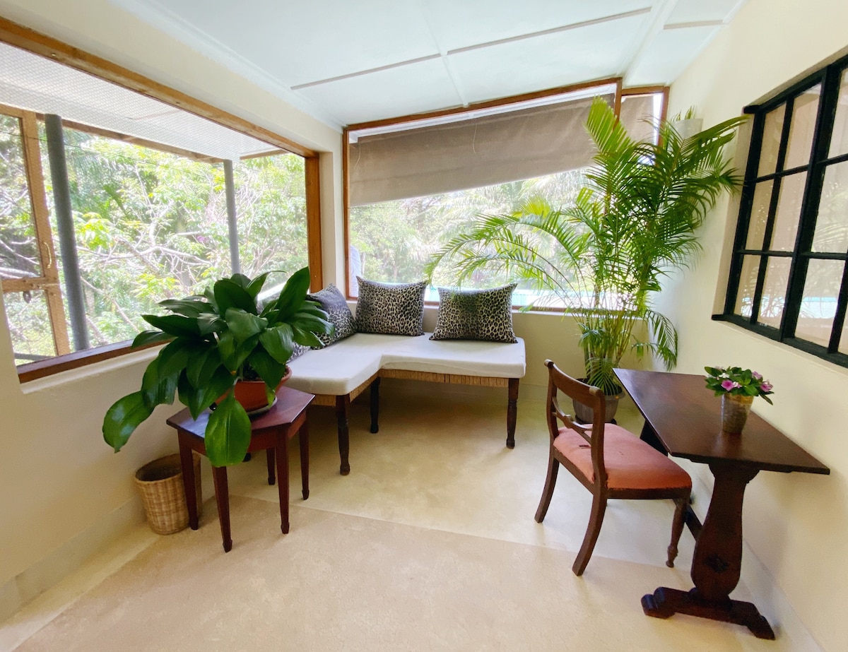 The Treetop studio is situated a a beautiful tropical nursery - in quiet surroundings, only 5 min from town, 10 min from the airport & 7 min to the beach. The studio is on the second floor with views that make you feel like you are in the treetops. Secure & free parking is available on the premises. The plot has 2 main houses, the nursery & the most magnificent tropical garden on 2,5 acres with chickens, peacocks and ducks roaming the garden freely. Your host, Evelyn, lives on the premises.