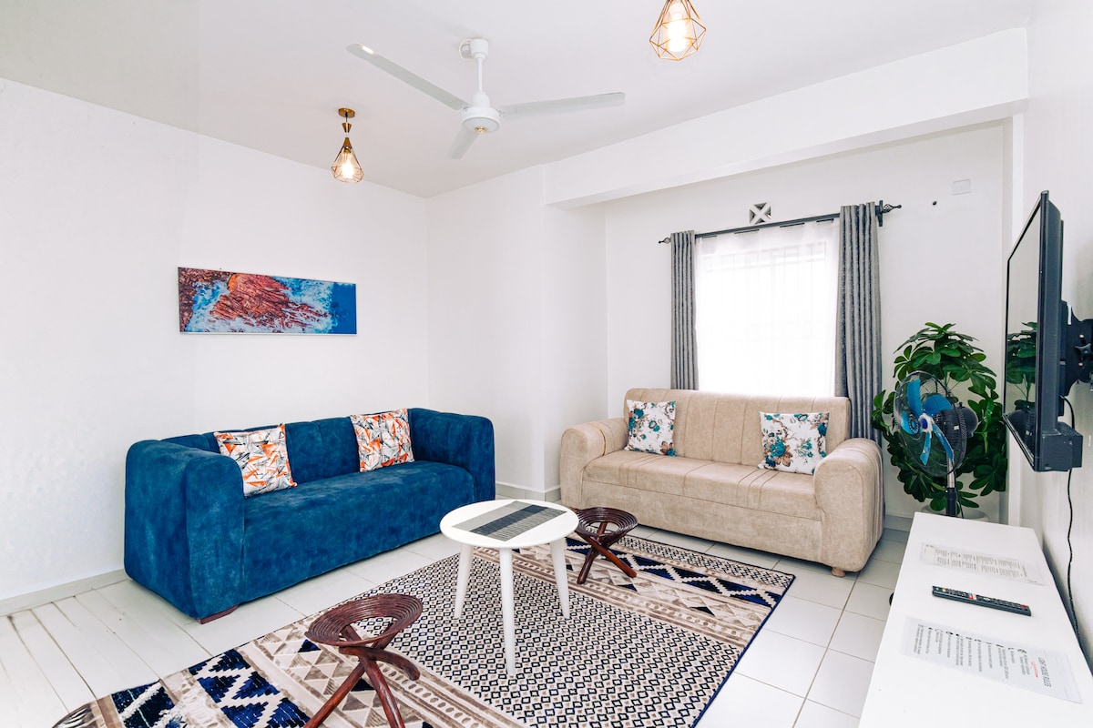 Casa moderna al cor de MSA Relaxa't en un apartament elegant i modern de 2 habitacions dissenyat per a la comoditat després d'explorar les platges de Mombasa, el nucli antic i les atraccions històriques. Lluminós, espaiós i moblat amb cura, aquest allotjament ofereix un refugi tranquil a pocs minuts de distància, com es mostra a continuació; camina fins a Pembe za Ndovu A 5 minuts en cotxe de Fort Jesus i el nucli antic A 7 minuts de la zona costanera A 18 minuts de l'aeroport i a 25 minuts de SGR Ideal per a turistes, parelles i famílies i tot el que els viatgers necessiten per a una estada sense estrès a Msa