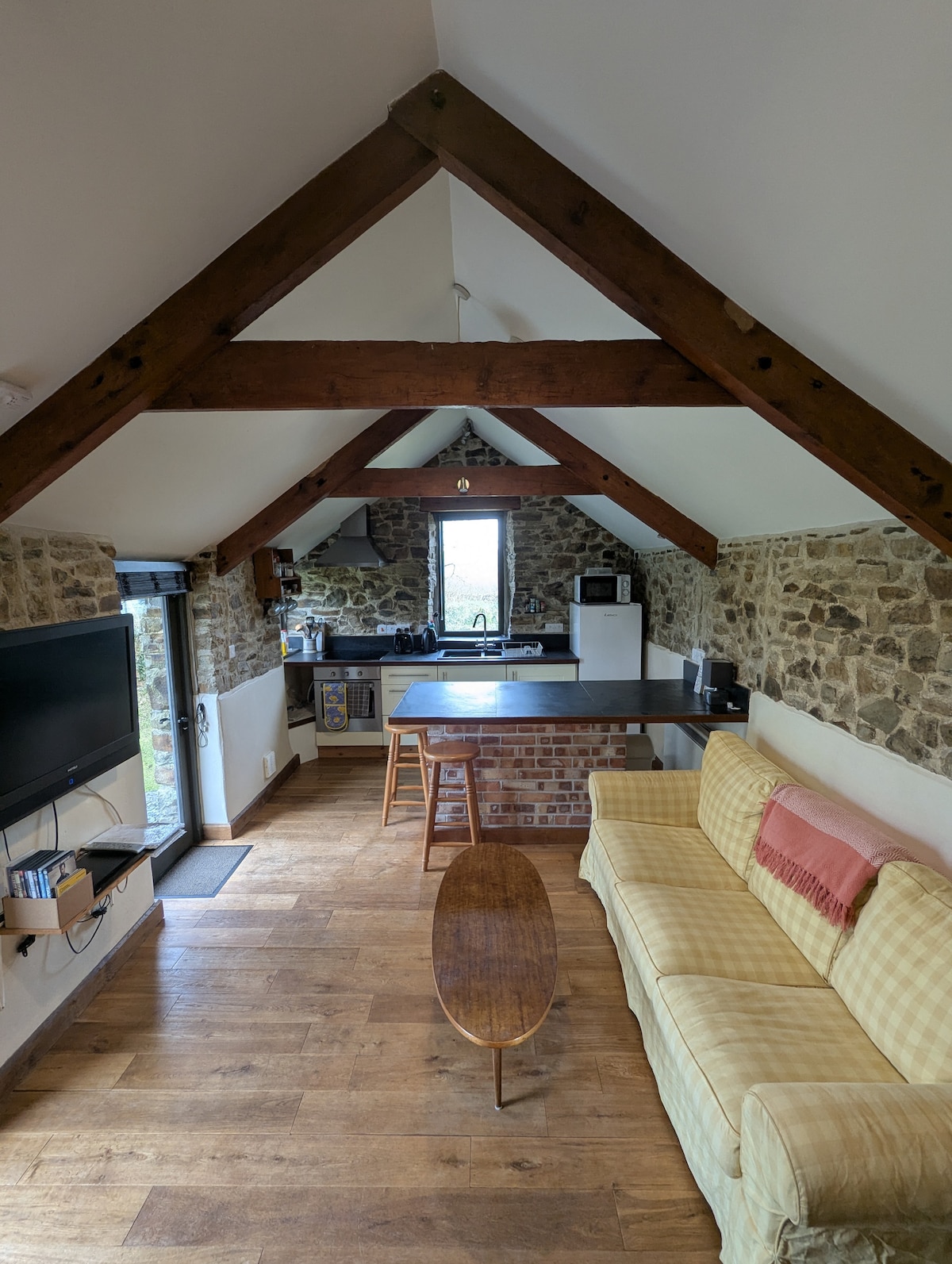 Aquest graner independent i pintoresc és ple de caràcter i pau (sense wifi). Hi ha una zona de cuina/saló oberta amb una estufa de llenya acollidora (llenya disponible per 7 £ en efectiu per xarxa) i una barra d'esmorzar amb tapa de pissarra. La propietat té terra de roure sòlid a tot arreu, excepte la pissarra al bany, així que no t'oblidis de les sabatilles! La cuina inclou forn, fogons, nevera-congelador, torradora, microones i bullidor. La zona d'estar acollidora s'obre a un pati atractiu i una zona d'herba. No es permeten animals de companyia.