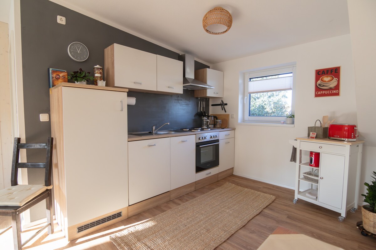 Asseu-te i relaxa't... El nostre pis d'una habitació es va crear només amb materials de construcció natural. Amb molt d'amor pels detalls, he processat fusta de pissarra i roure natural aquí. L'interior d'alta qualitat et convida a relaxar-te. Aquí, a la porta d'entrada a Vogelsberg, hi ha l'entrada al carril bici de muntanya del volcà "Mühlental". Estació de càrrega de bicicletes directament al pis. Després, una sauna? Si t'interessa, hi ha la possibilitat de donar una volta amb els meus Oldies dels Estats Units;-)