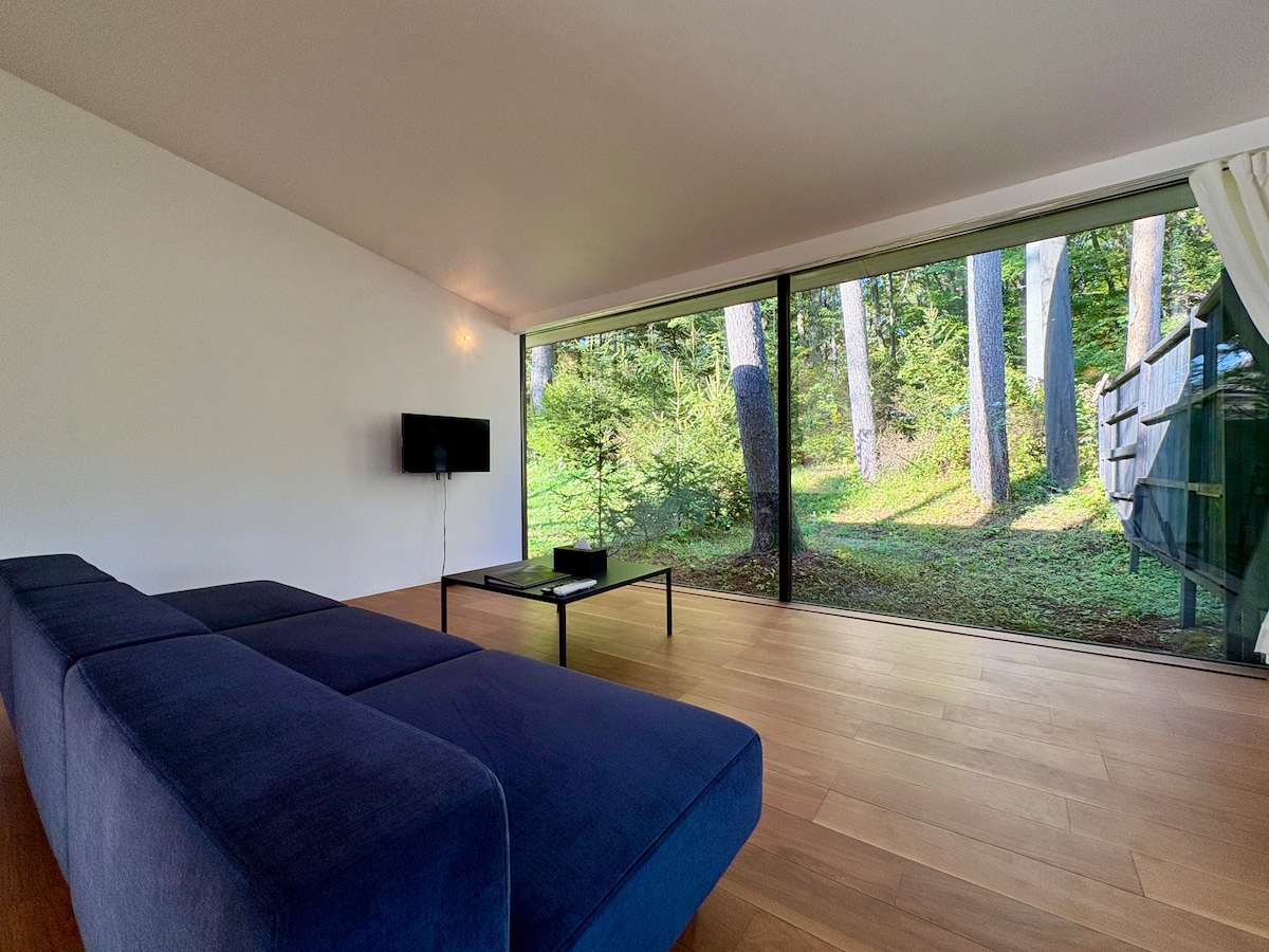 Oferim un moment especial per aprofundir el teu vincle amb els teus éssers estimats en un espai de luxe amb el so d'un rierol que ve de la terrassa i el cant dels ocells al bosc. Al costat d'un bosc nacional, pots refrescar la ment i el cos mentre gaudeixes de la natura durant les quatre estacions, com ara fer barbacoa, observar les estrelles, relaxar-te al costat de la llar de foc, llegir o dormir una migdiada a la terrassa. Hi ha descomptes especials disponibles per als hostes que s'allotgin durant 7 nits o més. Posa't en contacte amb nosaltres.