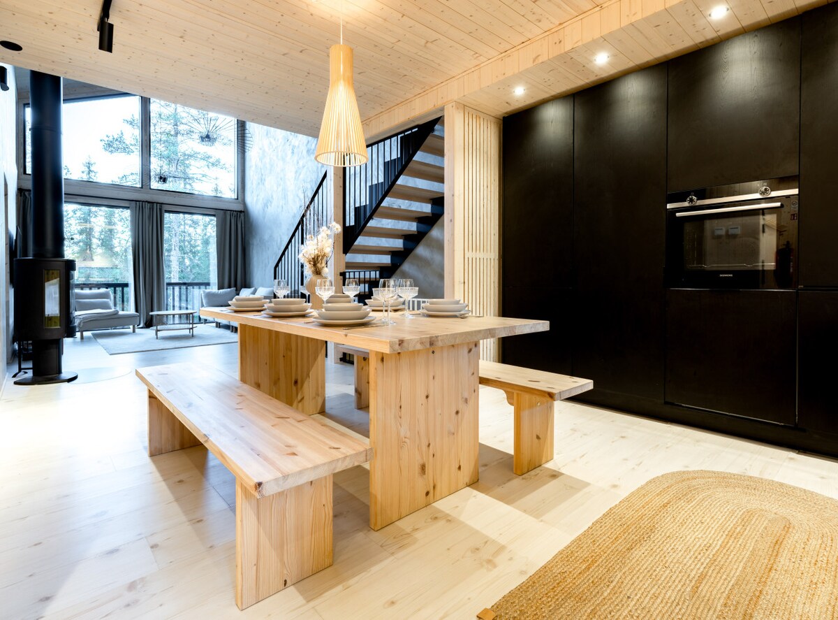 La Vil·la KaLi B ofereix allotjament de vacances d'alta qualitat a prop del centre de Levi. Les grans finestres de la vil·la porten la natura a la sala d'estar i s'obren a un bonic paisatge forestal. A la terrassa coberta, podràs relaxar-te a la banyera d'hidromassatge amb total tranquil·litat i, a l'interior, trobaràs un entorn modern i luxós tant per a una escapada com per a unes vacances més llargues. Aquesta llana combina a la perfecció l'elegància i la comoditat amb la pau de la natura de Lapònia. També hi ha una taula per mantenir els esquís! La tarifa de la banyera d'hidromassatge és de 100 € per reserva