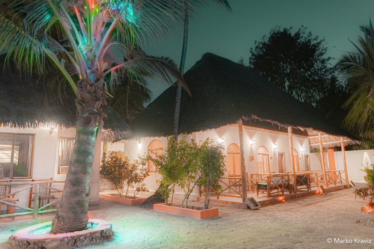 Visita'ns i gaudeix d'una vista inoblidable de la posta de sol sobre una de les millors platges de Zanzíbar, des dels nostres espaiosos balcons, mentre gaudeixes de la brisa marina de l'oceà Índic. Mentre t'allotges amb nosaltres, gaudiràs de la configuració de l'hotel (una barreja de tradició i modernitat suahili), el jardí, el personal acollidor i la cuina suahili. Una platja de sorra blanca espaiosa i immaculada es troba a només 5 minuts a peu de l'hotel, on pots relaxar-te, banyar-te, bronzejar-te, socialitzar i gaudir d'activitats recreatives a l'aire lliure.