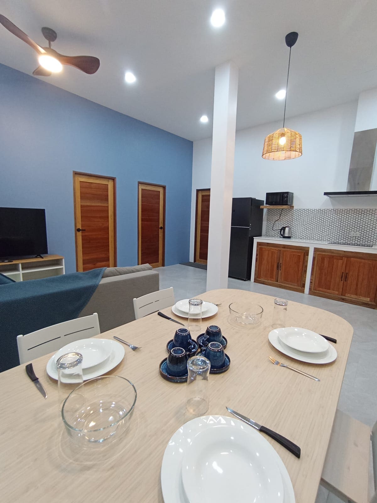 Relaxa't i relaxa't en aquesta petita, tranquil·la, privada i elegant casa amb encant rústic. La sala d'estar oberta està decorada amb bon gust amb mobles tradicionals tailandesos i compta amb una cuina totalment equipada, un còmode saló i menjador. Les portes s'obren a una àmplia terrassa exterior, amb una sala, que ofereix el lloc perfecte per relaxar-se. Situada a la vessant del turó, entre una exuberant selva tropical, la casa compta amb la màxima privacitat, impressionants postes de sol i vistes al mar.
