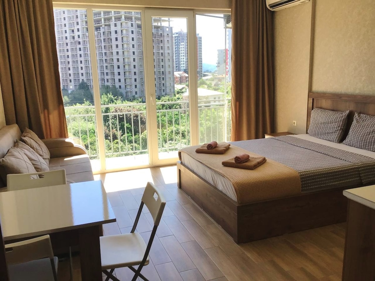 Sunset Studio | Crowne Plaza – studio with sea view. To the sea – a few steps, to the center of Batumi 10 min by car, to the Botanical Garden – 2 km This is the place where you will: - meet the sunsets with a glass of wine, - enjoy the clean air surrounded by green mountains and admire the authentic Georgian houses, - swim in the sea, - to look at the hustle and bustle of the city from afar and realize that it doesn't concern you.