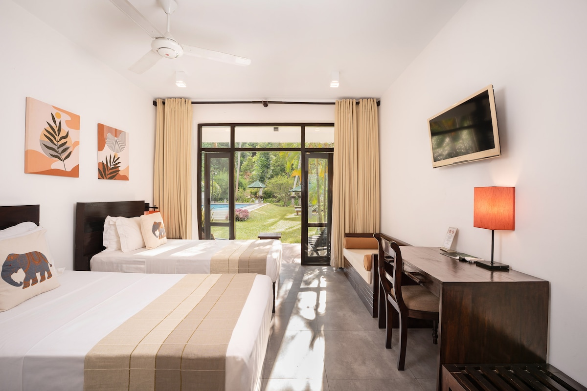 Els nostres bungalous privats i espaiosos amb vistes a la piscina ofereixen una estada de luxe envoltada de la vegetació exuberant de la selva. Desperta't amb el so de la natura, observa els micos que es balancegen entre les palmeres i gaudeix de l'encant dels banys a l'aire lliure. Surt i relaxa't a la nostra piscina de 14 metres: el lloc perfecte per relaxar-te tot el dia. A només 5 minuts a peu et trobaràs al cor de la ciutat platja d'Ahangama, on pots fer surf, nedar o explorar alguns dels tranquils cafès de platja de la zona o gaudir de la vibrant vida nocturna.