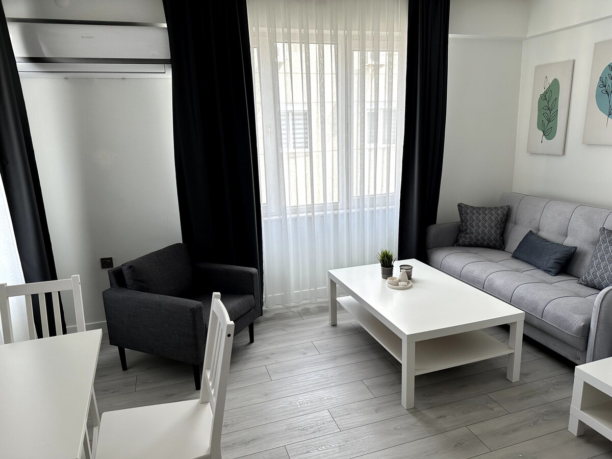Situat a Gürsu, Konyaaltı, a només 250 metres de la platja, el nostre apartament 1+1 té capacitat per a 4 hostes. Situat en un carrer tranquil i segur, disposa de 2 banys, una cuina totalment equipada i un espai acollidor. A poca distància a peu de la platja, els restaurants i els mercats, ofereix una estada tranquil·la. Si busques un allotjament net, lluminós i còmode, ens encantaria allotjar-te!
