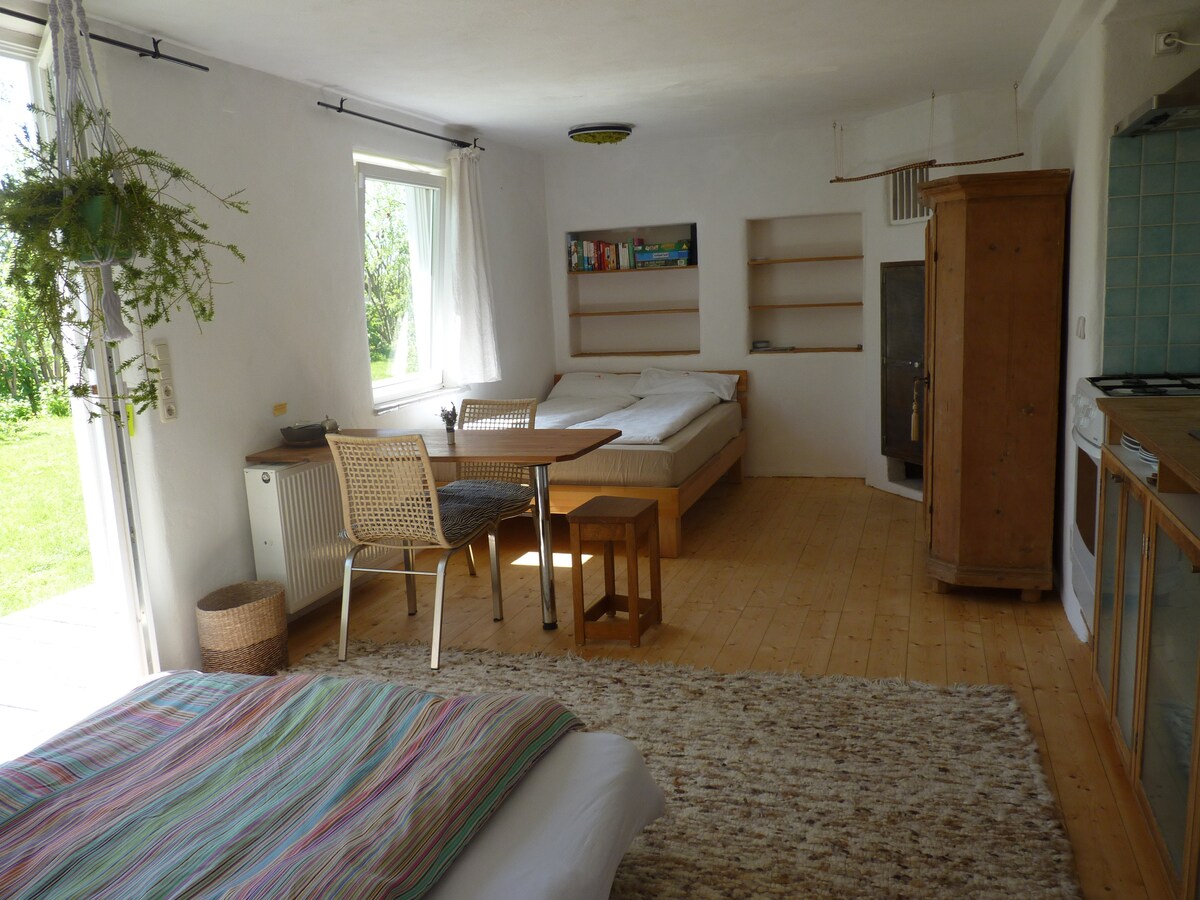 L'estudi es troba al segon pis d'una casa rural modernitzada en una ubicació espectacular. L'allotjament es troba a la vessant de l'elevació més alta davant dels Alps, al nord de Chiemgau. Des de la granja tens una vista a l'est sobre el país i cap al sud fins a la serralada. El Chiemsee està a uns 25 km, al municipi hi ha un llac de bany en una ubicació preciosa. Dirigim una granja ecològica amb gallines, abelles i senglars salvatges i cria d'ovelles.