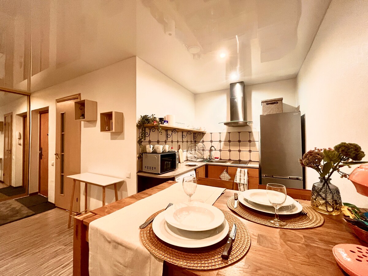 Ampli i elegant apartament d'un dormitori (40 metres quadrats) situat a la 7a planta amb vista panoràmica, per a un allotjament còmode d'entre 1 i 3 persones. L'apartament està equipat amb tots els electrodomèstics necessaris per viure i relaxar-se. A la sala d'estar hi ha un televisor gran amb SmartTV(Youtube, Netflix). L'apartament té una xarxa wifi ràpida. Arribada i sortida sense contacte. Per allotjar els hostes, l'apartament disposa d'un sofà doble i un llit plegable individual addicional (185 cm).