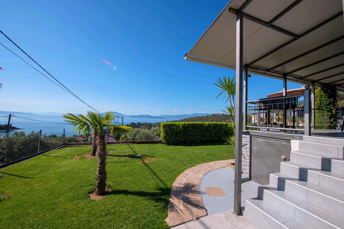 La residència és un pis reformat amb una mida de 100 metres quadrats. Es troba a la planta superior de la nostra casa de vacances a l'assentament costaner de Marathos a Magnesia, a uns 10 km de la ciutat de Volos i a només 100-150 metres de la platja més propera. Té una vista panoràmica de tot el golf Pagasetic. La residència pot allotjar una o més famílies o grups de 2 a 6 persones. Tots els dormitoris són assolellats i tenen una vista panoràmica del mar .