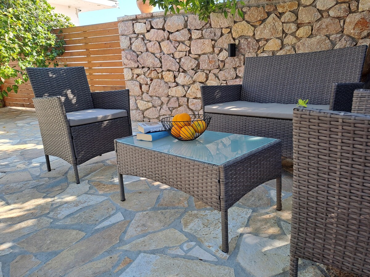 La casa es troba a la part superior del mar, amb una vista única de la badia de Messinian i postes de sol inoblidables. Et dona la sensació que estàs a bord d'un vaixell. Pots gaudir del gran jardí, així com de la resta de l'espai, que està dissenyat per proporcionar comoditat i relaxació a les teves vacances. El mar està a poca distància a peu de la casa (5 minuts)