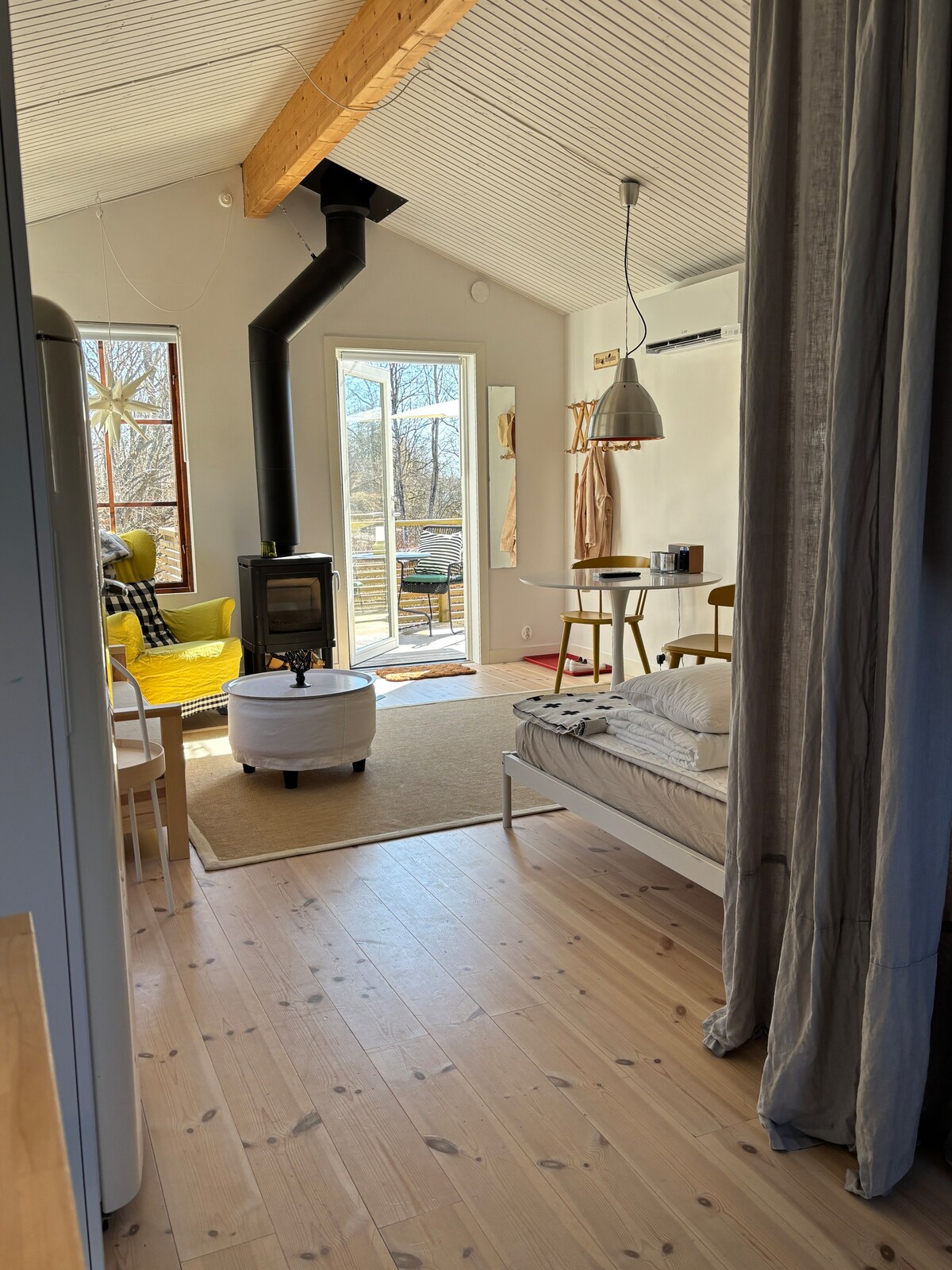 Perfecte per a les persones que viatgen pel sud de Suècia! Aquest allotjament es troba al bell camp de Småland, molt còmode a només 3 minuts de l'E4. Wallbox per carregar el teu vehicle elèctric disponible just al costat de la porta! Viviràs a la teva pròpia casa petita amb una vista meravellosa sobre el nostre hort de pomes. Esmorzar opcional, amb un cost addicional. Accés a una barca de rems a 20 minuts.