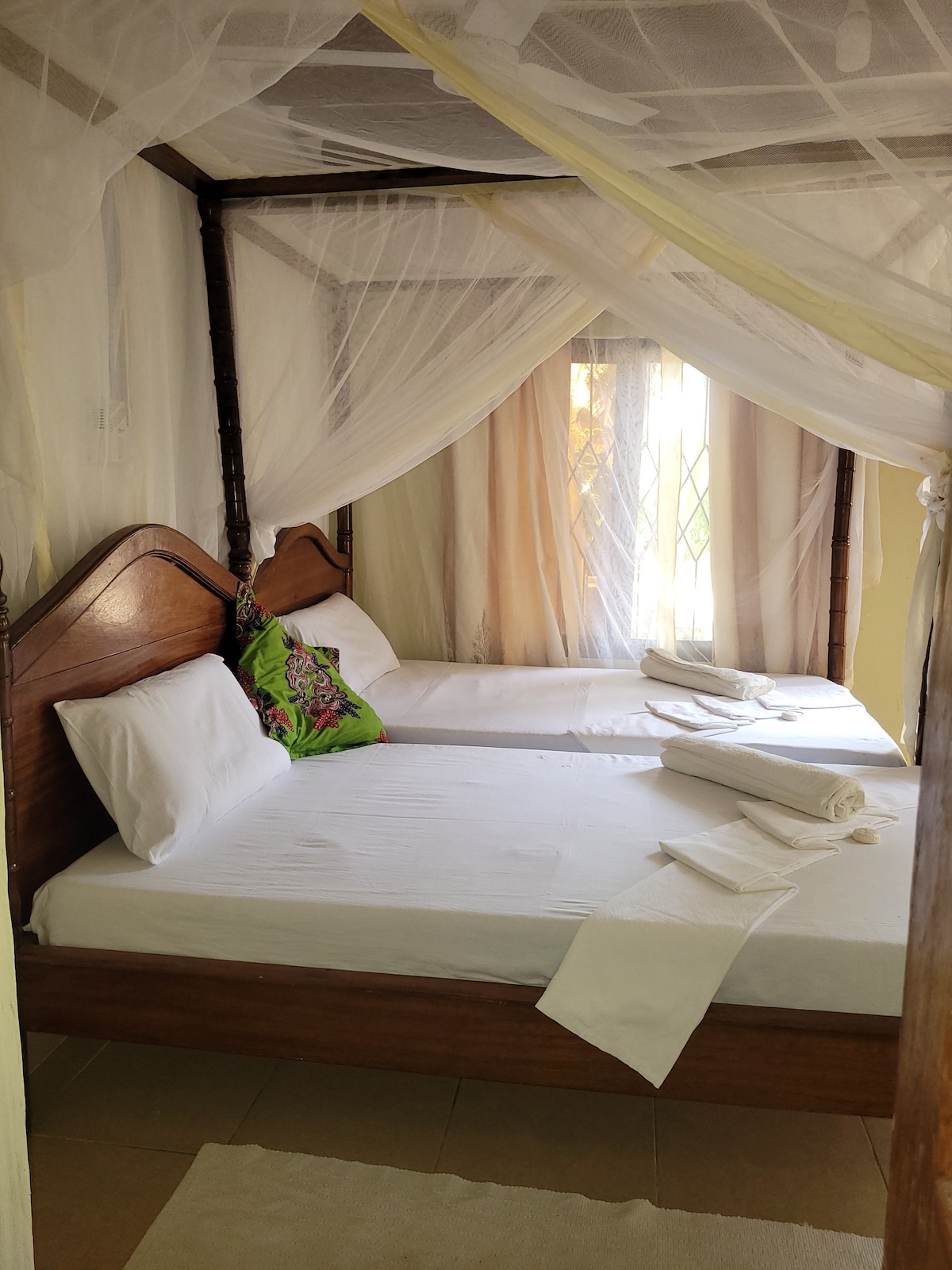 Encantadora casa d'hostes amb un dormitori en un recinte madur, a només un pas d'una de les platges més boniques de Kenya. A cinc minuts del centre comercial, pista d'aterratge, camp de golf i hospital. La recollida gratuïta a l'aeroport local i des de Mombasa té un cost de 6000 ks.local i, viatges a Mombasa per veure el casc antic i Fort Jesus. Tenim els famosos micos Colobus en perill d'extinció al jardí. La majoria de les tardes tenim una taula de cubets de llana de vegades 2 visitant la piscina.