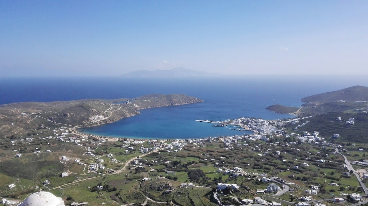 La casa és una casa unifamiliar situada a la platja d'Episkopi, a només 5min a peu, a on té una magnífica vista des dels balcons. A la planta superior hi ha la cuina i el saló i un balcó, mentre que a la planta baixa hi ha 2 dormitoris amb llit de matrimoni i un bany amb dutxa, a més d'un bon balcó amb una gran vista a la platja i al mar. La casa està situada en una zona molt còmoda, està a 10 minuts en cotxe del port (Merichas) i de Chora. És una casa genial per a famílies o 2 parelles!!!