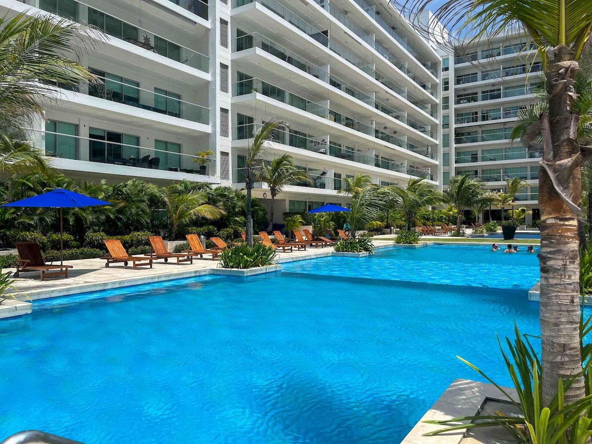 Impressionant apartament a The Beach Radisson Resort Residences, vistes extraordinàries de la Ciénaga, la platja i la ciutat; accés directe a les platges més boniques de Cartagena. A 5 minuts de l'aeroport i a 10 minuts del nucli antic (Ciutat Murada) en cotxe. Els hostes tenen accés a tots els serveis del complex, com ara gimnàs, diverses piscines, bars, restaurants, spa, jacuzzis a l'aire lliure, wifi, aire condicionat, zones de barbacoa, recepció 24 hores, seguretat, botziner, servei d'habitacions, etc. Només els hostes registrats poden accedir a l'apartament