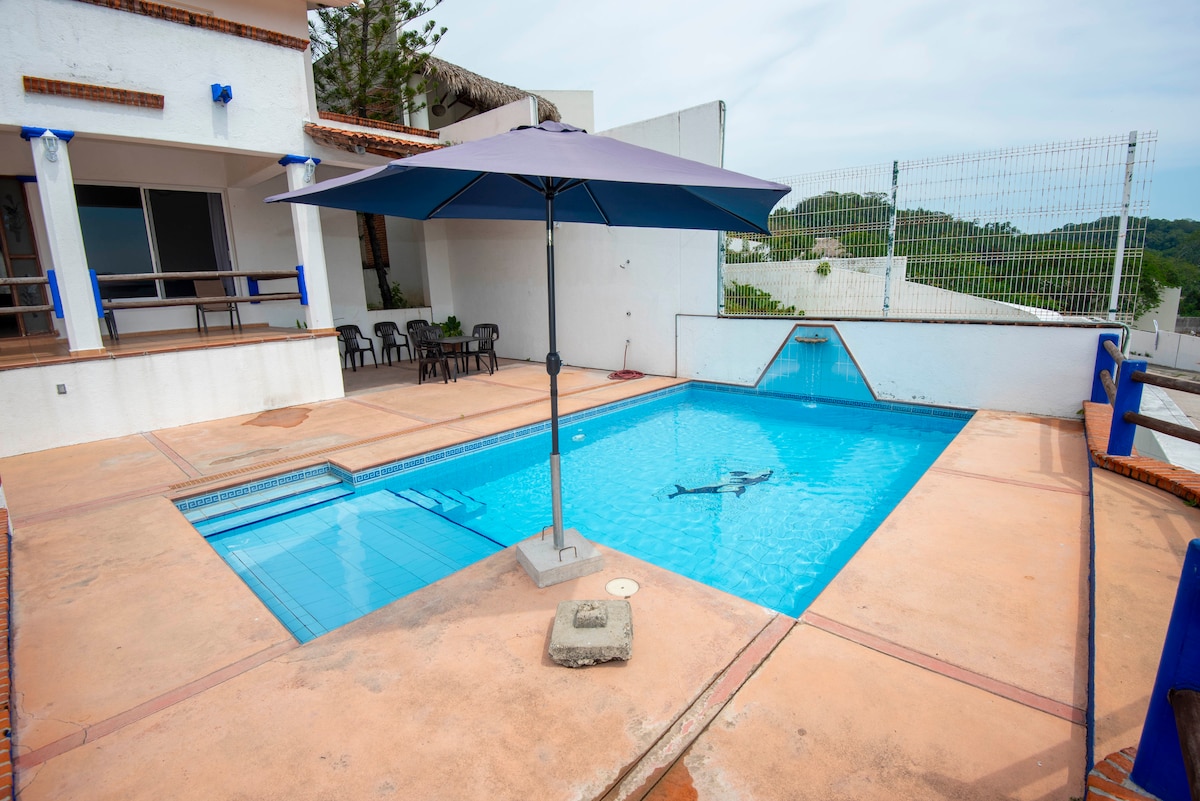 Palapa d'estil tropical, vida a l'aire lliure sobre les àmplies vistes del Pacífic, l'illa, l'oceà i el Mtn. Capacitat per a 6 persones. Po privat! Comoditat i serveis moderns. Aire condicionat, wifi, servei de neteja, accés a les instal·lacions del club de platja del complex hoteler Celeste i la preciosa badia a menys de 10 minuts de senderisme per la carretera. Nàpols al penya-segat de Hammock o gaudeix de la brisa marina a l'ombra fresca de la palapa al costat de la piscina. Cuina totalment equipada per menjar o gaudir dels restaurants de La Crucecita o Santa Cruz. A només 10 minuts.