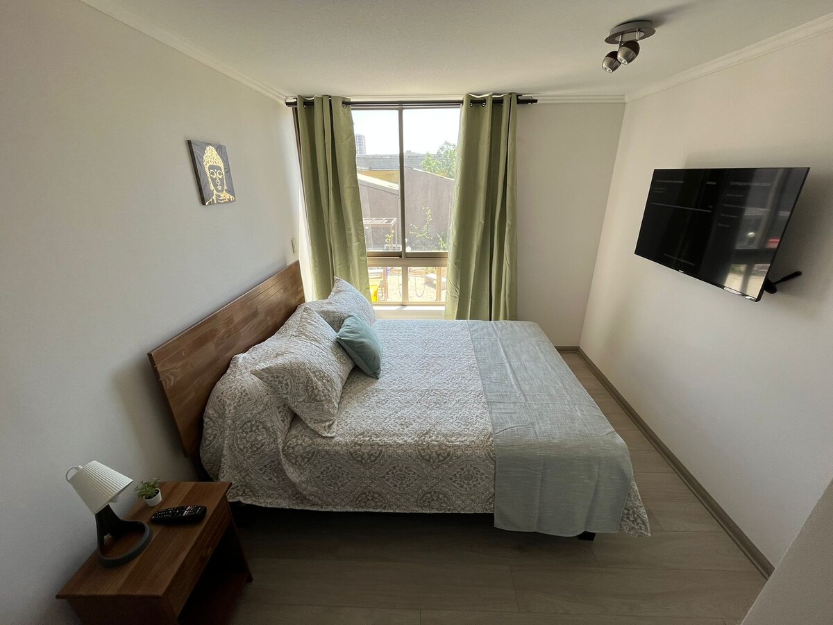 Acollidor i lluminós apartament amb balcó, equipat amb un llit de matrimoni i un futon per a un tercer hoste. Cuina totalment equipada Wifi de 500 Mbps Televisió intel·ligent Emmagatzematge d'equipatge gratuït S'admeten animals de companyia A només 3 minuts del metro departamental, hi ha supermercats, restaurants i cafeteries a poca distància a peu. L'autopista central és a només 5 minuts. Gaudeix d'un gimnàs, zones de barbacoa i bugaderia d'autoservei en un edifici residencial segur amb conserge les 24 hores. Ideal per a parelles i estades llargues. Reserva i viu Santiago com si fossis a casa!