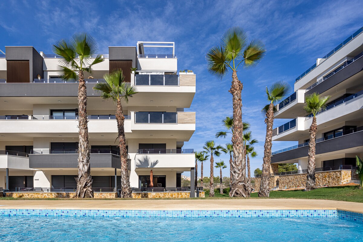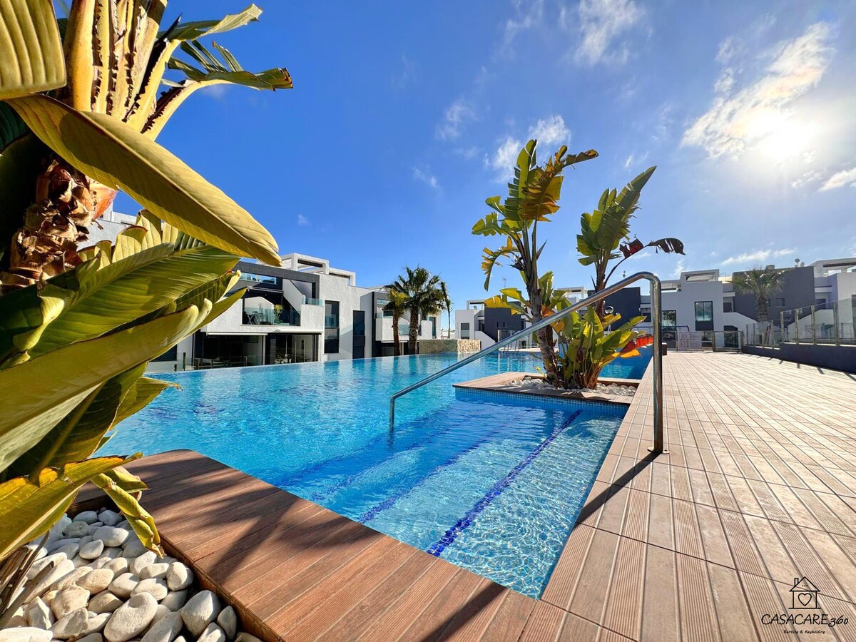 Gaudeix de la màgia d'Espanya en aquest apartament de luxe a Villa Martin, Torrevieja! Amb 2 dormitoris elegants, 2 banys moderns i 2 terrasses espaioses, cada detall està dissenyat per a la màxima comoditat. Relaxa't al teu jacuzzi privat o dona't un bany a la piscina, gaudint de la suau brisa mediterrània. Aquesta propietat nova i totalment moblada ofereix un aparcament còmode. A només uns passos de restaurants, botigues i atraccions autèntics, aquest pis encarna l'essència de la vida espanyola.